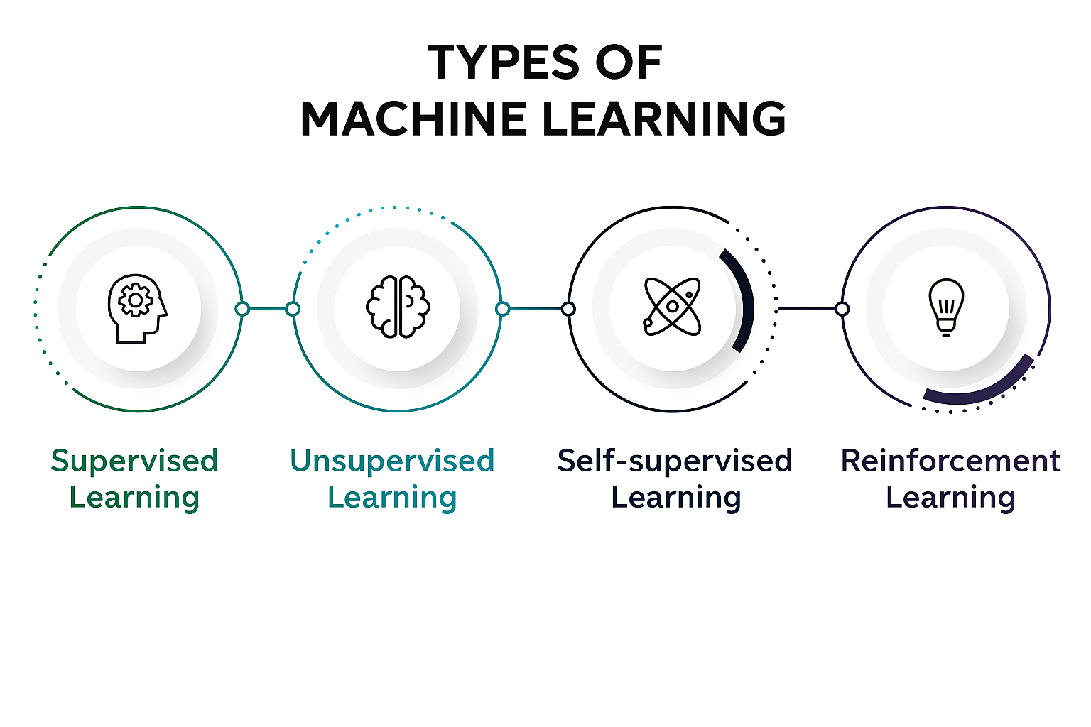 Machine Learning is commonly divided into three main types. Recently, a fourth paradigm known as self-supervised learning has emerged, bridging the gap between supervised and unsupervised approaches by leveraging unlabeled data to generate its own supervision signals. Let's delve into each of these.