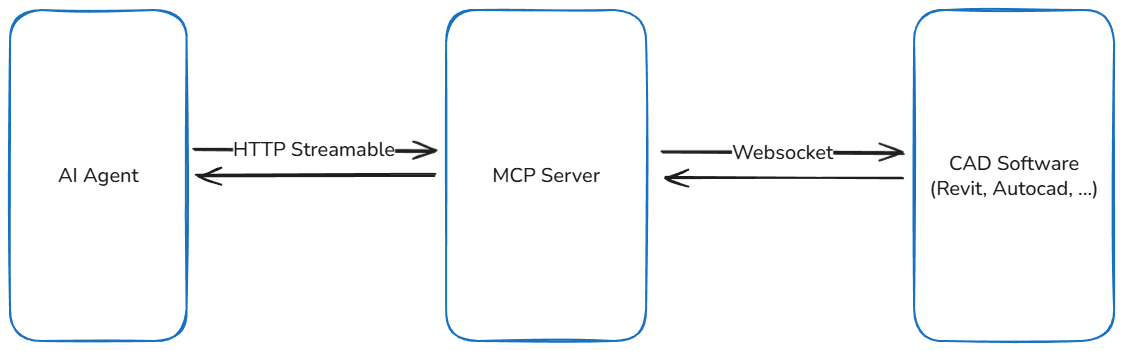 Major of CAD software are "offline" software, as such Websocket is a good choice for connection protocol between MCP Server and CAD software.