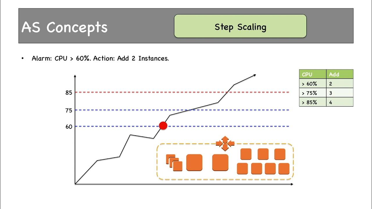 Step Scaling allows you to define scaling adjustments based on the magnitude of the metric breach. For example, if CPU usage exceeds 50%, you might add 1 instance; if it exceeds 80%, you might add 2.