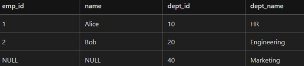 RIGHT JOIN Departments d ON e.dept_id = d.dept_id;